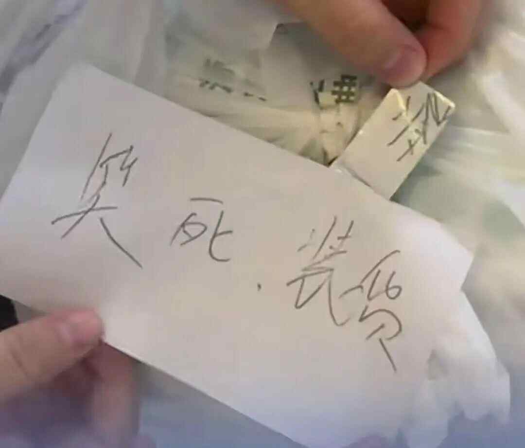 该女子描述,下单后不久,店员致电告知其中的香锅花菜已售罄,能否更换为辣椒炒肉或其他,经过沟通后她选择了辣椒炒肉。然而当外卖送达时,她发现餐品包装上竟贴着一张写有“笑死,装货”字样的纸条,这让她十分愤怒。