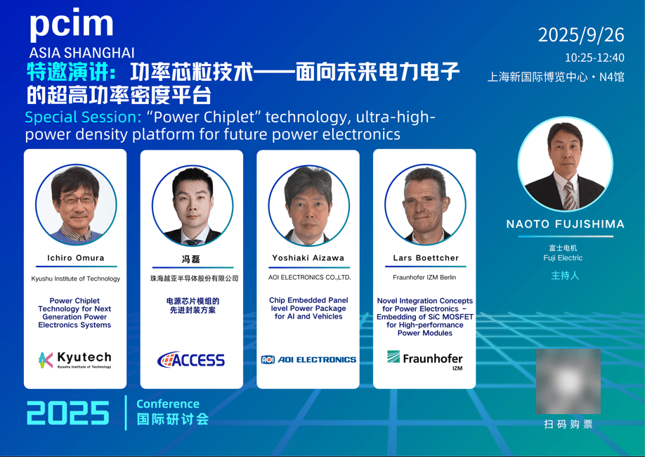 本场特邀演讲将首次提出“电源芯粒(Power Chiplet)”创新概念,作为应对AI服务器、电动汽车车载充电器等领域对元器件小型化日益增长需求的新一代解决方案。演讲由九州工业大学大村一郎教授组织、富士电机藤岛直人先生主持,汇聚了来自中日欧的杰出专家学者,共同探讨芯片嵌入式PCB技术实现超高功率密度和系统集成的创新路径,为突破摩尔定律限制、降低成本并实现异构集成提供了全新思路。