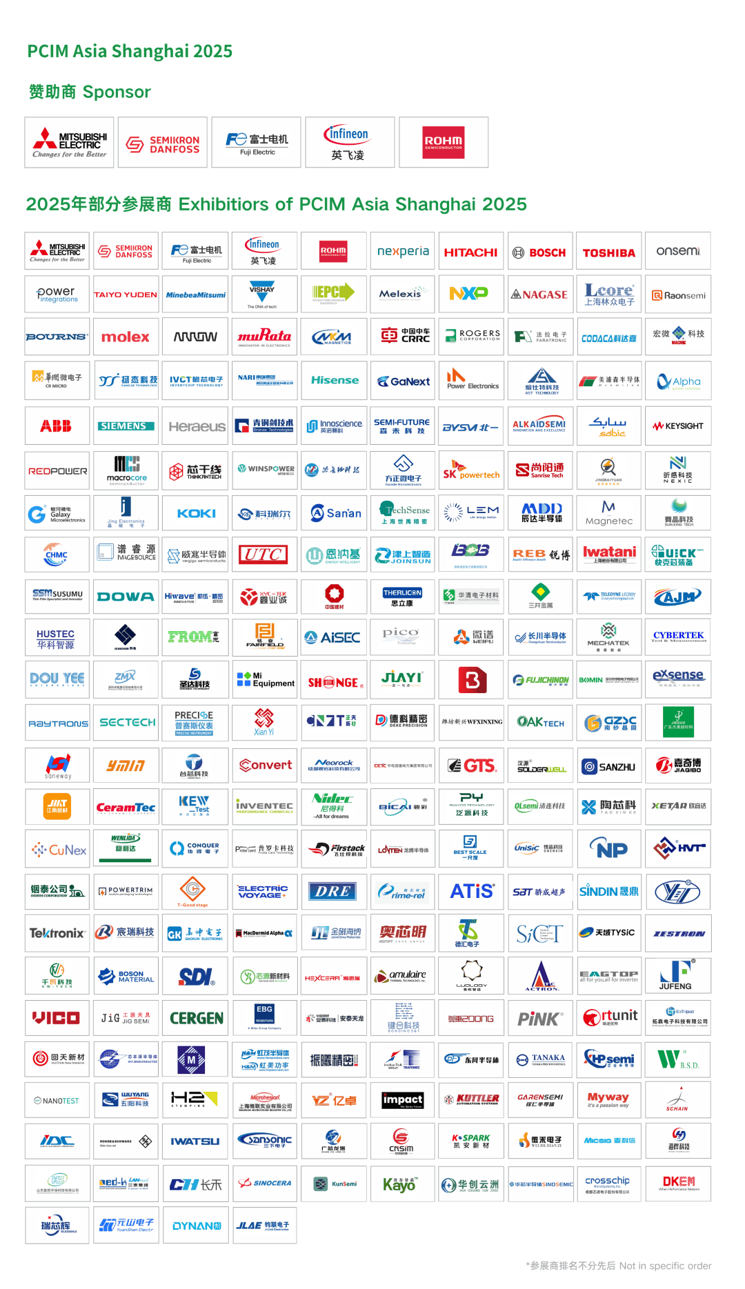 2025年展会展览面积达25,000平方米,预计吸引超260家来自国内外的行业领军企业。五大赞助商:三菱电机、赛米控丹佛斯、富士电机、英飞凌和罗姆将继续鼎力支持PCIM Asia Shanghai 2025。更有众多国内外知名企业已确认参展,包括安森美、安世半导体、博世、东芝、方正微、宏微、华润微、基本半导体、美蓓亚、迈来芯、南瑞半导体、PI、日立能源、太阳诱电、威世、瑶芯微、宜普电源转换、英诺赛科、扬杰、中国中车、海信功率半导体等。它们将于为期三天的展会上呈现一系列涵盖功率半导体元件、集成电路、传感器、智能运动等电力电子相关创新产品及解决方案。